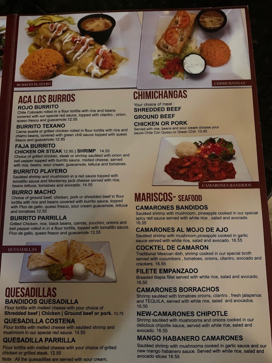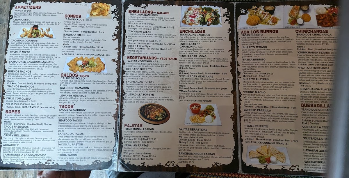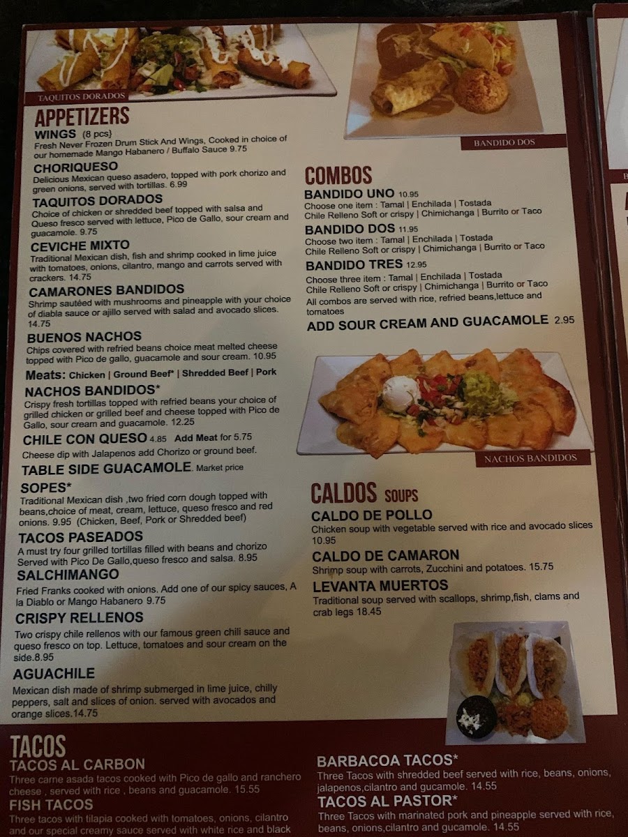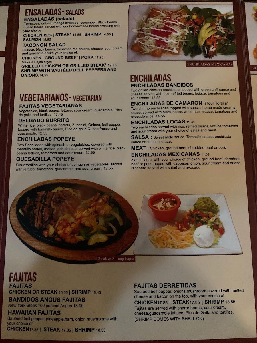 Sautéed bell pepper, onions, mushroom covered with melted cheese and bacon on the top. Fajitas are served with charro beans, sour cream, cheese, guacamole, lettuce, pico de gallo and tortillas. Shrimp comes with shell on.